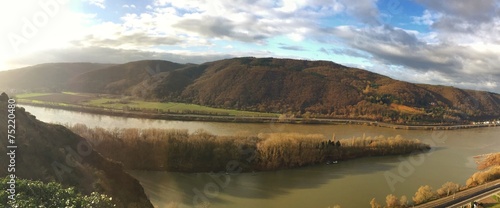 Aerial view of river in forest with mountain as Scandinavian landscape