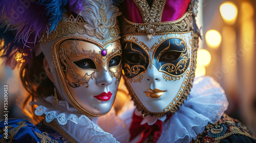 Elegant Venetian masks at a grand masquerade ball with warm bokeh lights