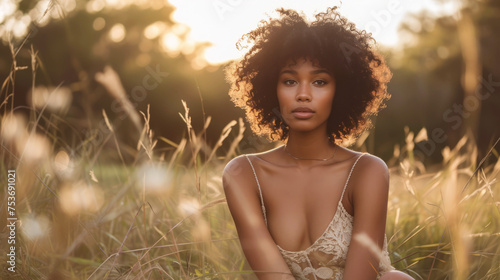 Elegant woman in sustainable fashion attire posing during a golden hour photoshoot