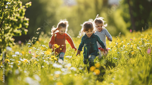 Happy school kids playing together outside in a spring meadow