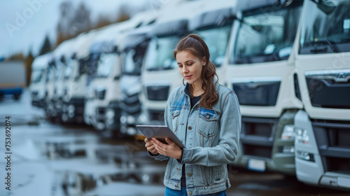 Fleet of white cargo trucks parked at a warehouse in sunset