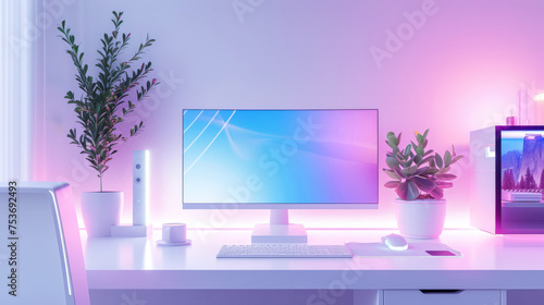 Tranquil minimalist workstation with computer and indoor plants