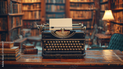 Vintage typewriter on a wooden desk with paper, ink, and flowers in a nostalgic setting