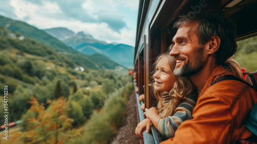 Scenic aerial view of a high-speed train journey through a forested valley at sunrise