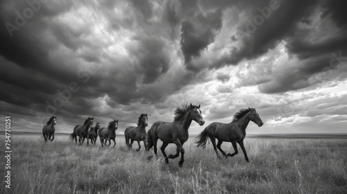 Majestic wild horses galloping across the plains in dynamic black and white photography