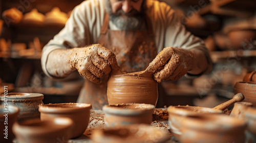 Artisan skillfully shaping clay on pottery wheel in a rustic studio