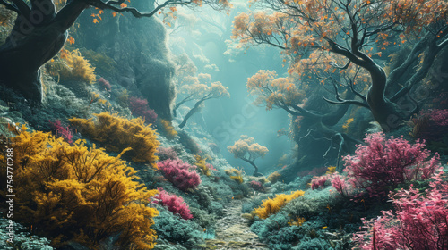 A serene mystical forest scene illuminated by dappled sunlight, featuring whimsical magical creatures, vibrant flora, and enchanting mushrooms creating a captivating and enchanting fantasy landscape.