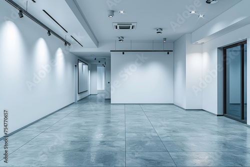 Modern art gallery with exquisite paintings on white walls reflection on polished floor