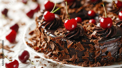 Slice of black forrest cherry cake with chocolate and whipped cream