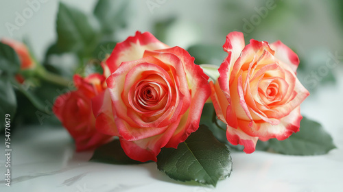 Red rose bouquet with ribbon and green leaves in an artistic style