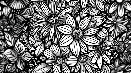 Artistic black and white floral doodle vector background with hand-drawn flowers and leaves