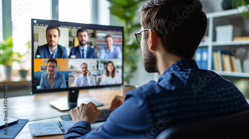 Data analyst working with multiple computer screens displaying digital data charts and code in a modern office environment