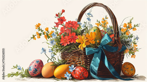 Watercolor illustration of an Easter egg surrounded by colorful spring flowers