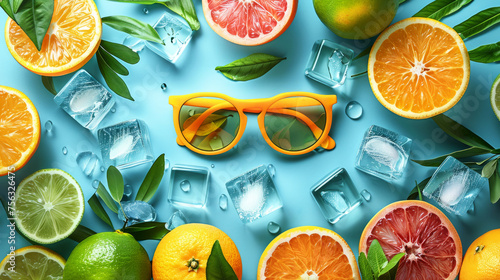 Slices of orange and citrus fruits with vibrant leaves on yellow background