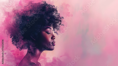 Woman with vibrant cloud-shaped hair against a dreamy pastel background