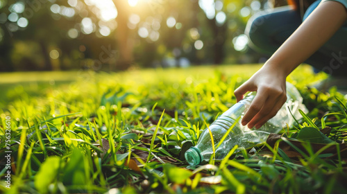 Environmentally conscious person picking up a plastic bottle from the grass