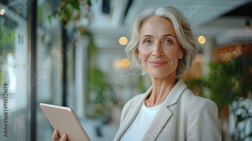 Smiling woman wearing apron holding tablet in cozy restaurant setting