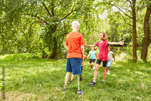 Handicapped boy with prsthetic limb riding in recumbent bike