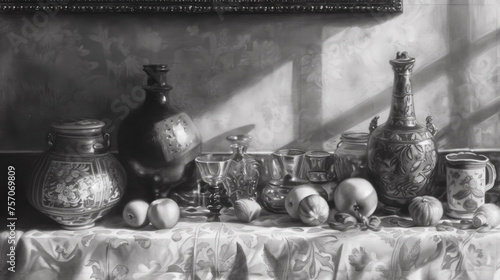 Vintage still life with assorted objects and fruits on a draped table