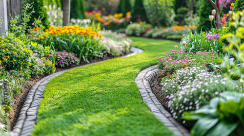 Lush garden pathway with vibrant floral design and pristine lawn care