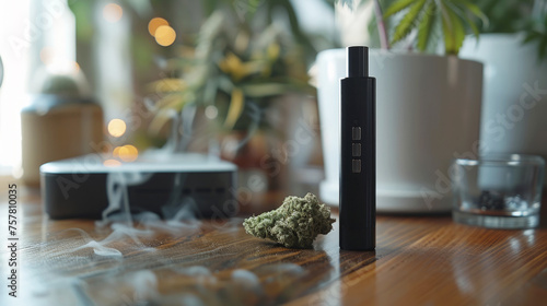 Modern minimalist vaporizer setup on a wooden table with plant decor