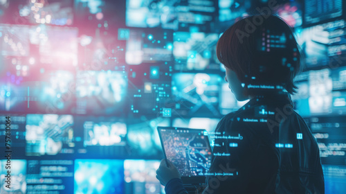 Futuristic robot interacting with holographic interfaces in a digital technology marketplace