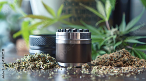 Sleek portable cannabis grinder on a reflective surface next to ground weed