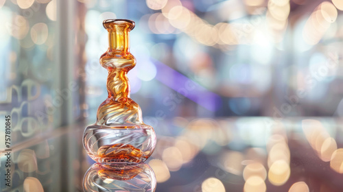 Elegant hand-blown glass bong with reflective surface and bokeh lights