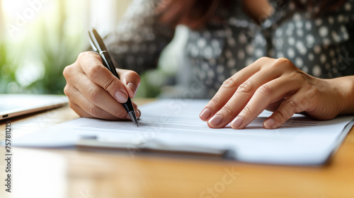 Business person checking off tasks on a complete checklist at a desk in an office environment