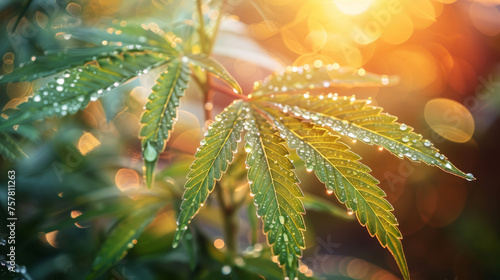 Close-up of dew-covered marijuana plant with natural bokeh light