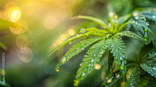 Close-up of dew-covered marijuana plant with natural bokeh light