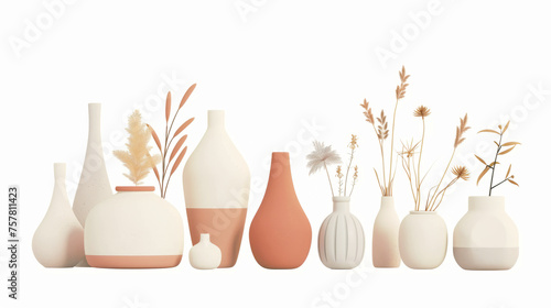 Minimalistic ceramic vases with dried floral arrangements on a white background