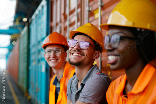 Multiracial team of smiling industrial workers enjoying a break inside a shipping container