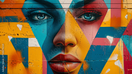 Vibrant graffiti mural of a woman's face with sunglasses on cracked wall