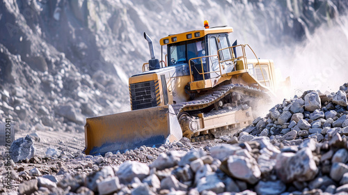 Bulldozer in action on a construction site moving rocks