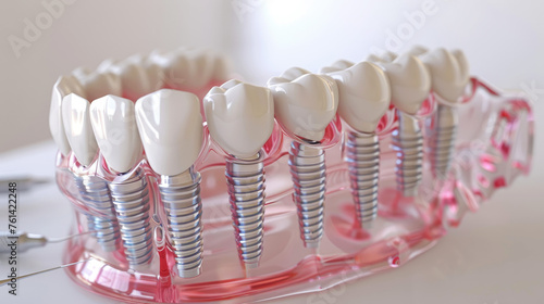 Dental implant illustration showing structure and placement in gums with natural teeth