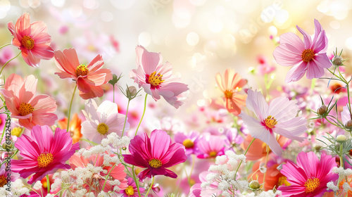 Vibrant Mother's Day banner with pink and white flowers and bokeh lights