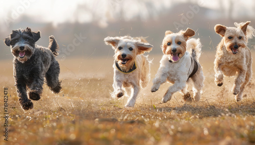 Joyful pack of four dogs enjoying a spirited run across a sunny field