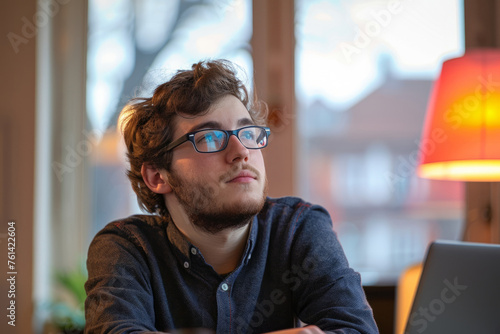 Contemplative man with glasses pausing work to look up in cozy office setting