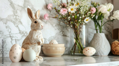 Fluffy white Easter Bunny among pastel white Easter decorations