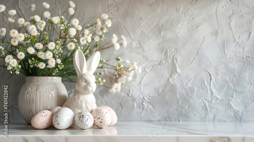 Elegant Easter setup with white bunny rabbit figurine and speckled eggs