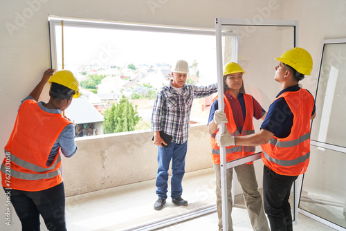 Construction coworkers carrying window frame while standing near supervisor at incomplete house site