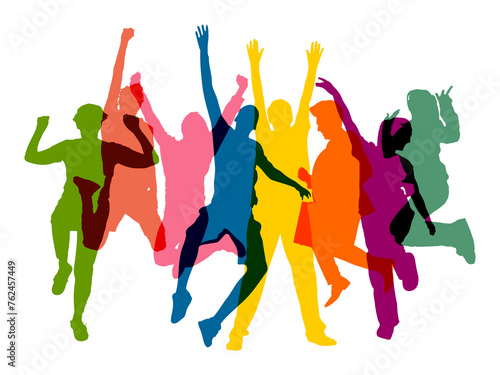 Bunte Silhouetten von jubelnden und vitalen Menschen vieler Generationen