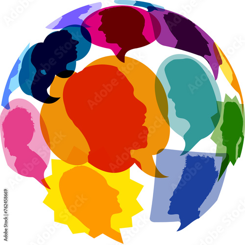 Bunte Sprechblasen mit Gesichtern bilden eine Weltkugel