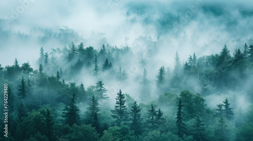 Mystical morning fog enveloping a dense evergreen forest