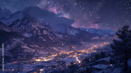 Starry nightscape over snowy mountains reflecting on a tranquil lake