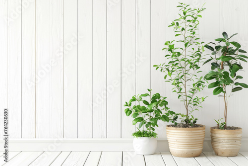 Arrangement of colorful miniature bonsai trees in various pots on white background