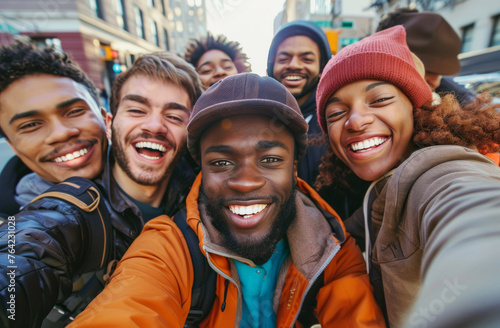 Friends taking a group selfie on a bustling city street, diverse and stylish