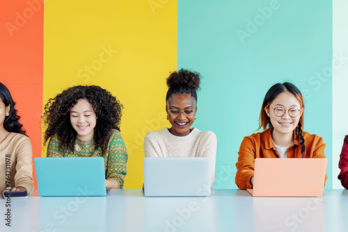 Smiling young people at a colorful workstation using laptops for a project