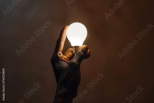 Human hand holding a glowing LED light bulb against a warm backdrop